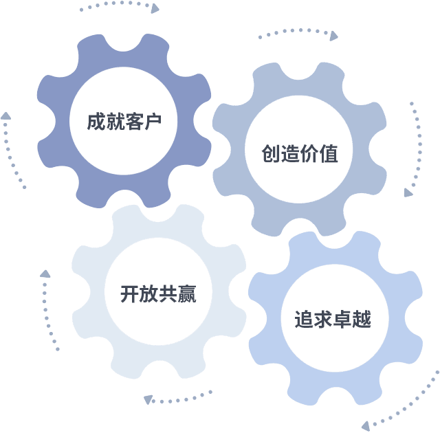 成就客户是一切决策的出发点,,创造价值是衡量所有工作的标准,,,,追求卓越是我们做事做人的态度,,,,开放共赢是我们的格局也是最终的结果。。价值观的齿轮环环相扣,,,推动着组织里的每个人不断向前。。。