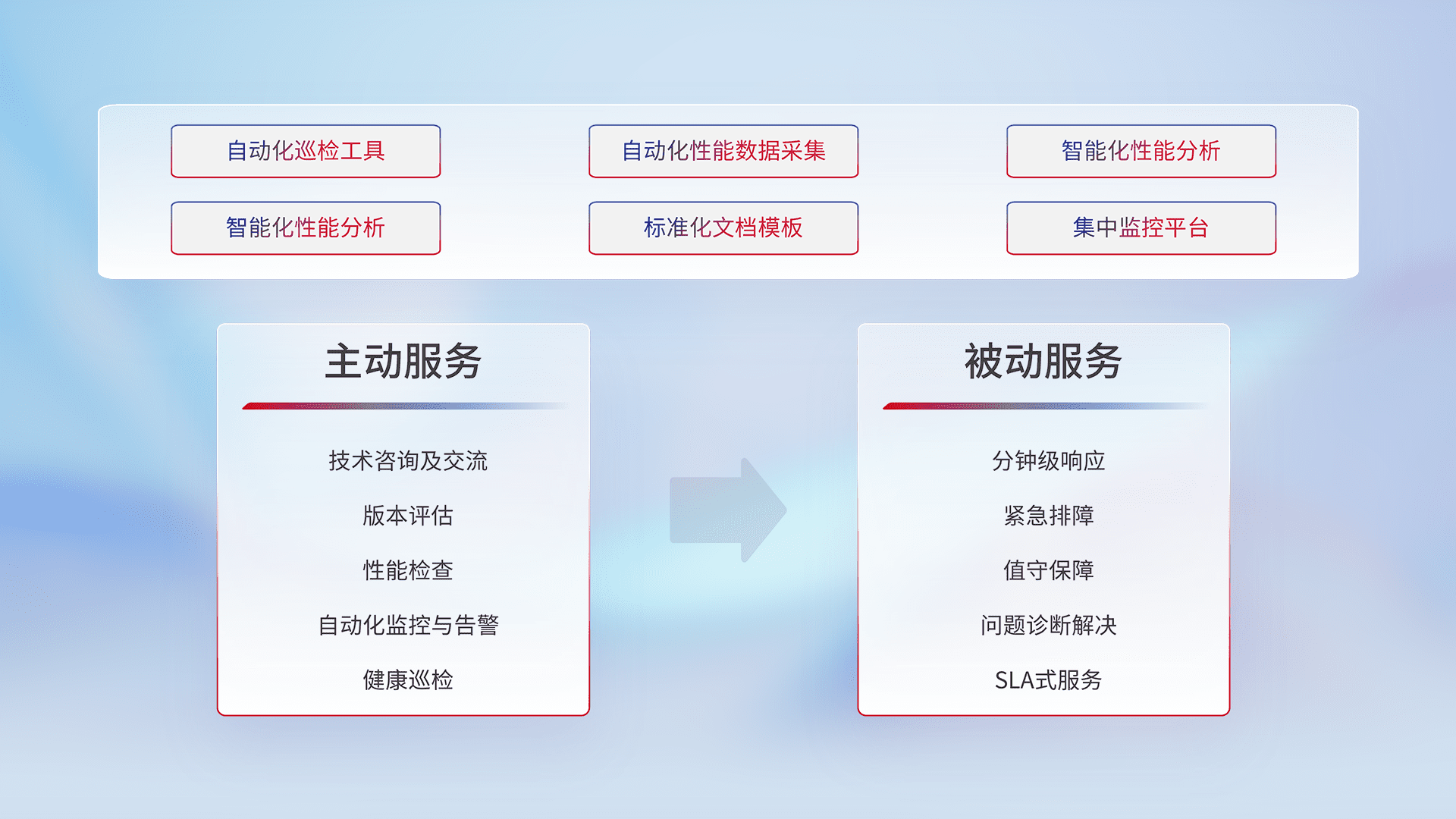 智能化工具和标准化文档,,,,保障服务质量,,,提供主动服务(包含技术咨询、、版本评估、、、、性能检查、、、自动化监控与告警、、健康巡检)和被动服务包含(分钟级响应、、、紧急排障、、、、值守保障、、、问题诊断解决、、SLA服务)。。。